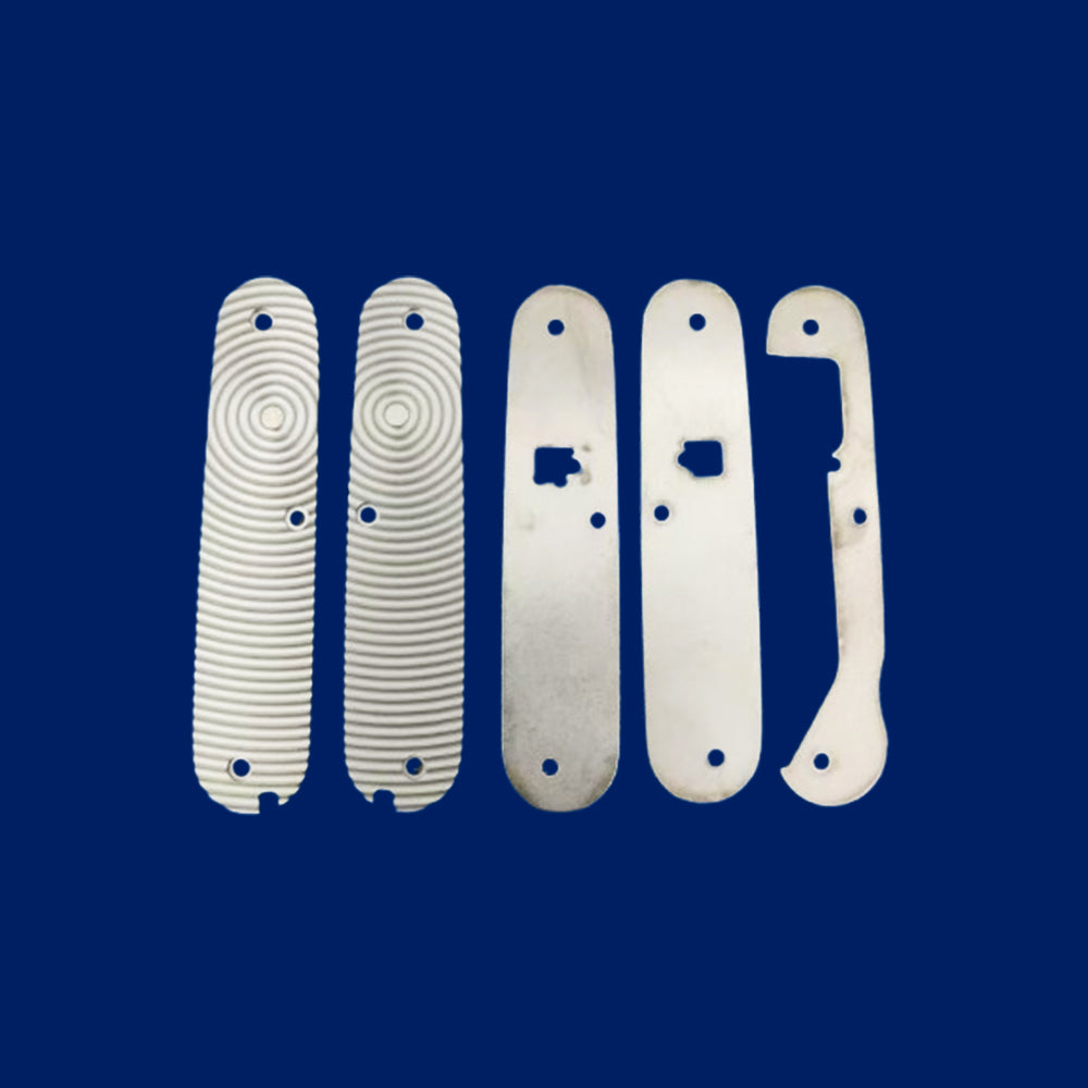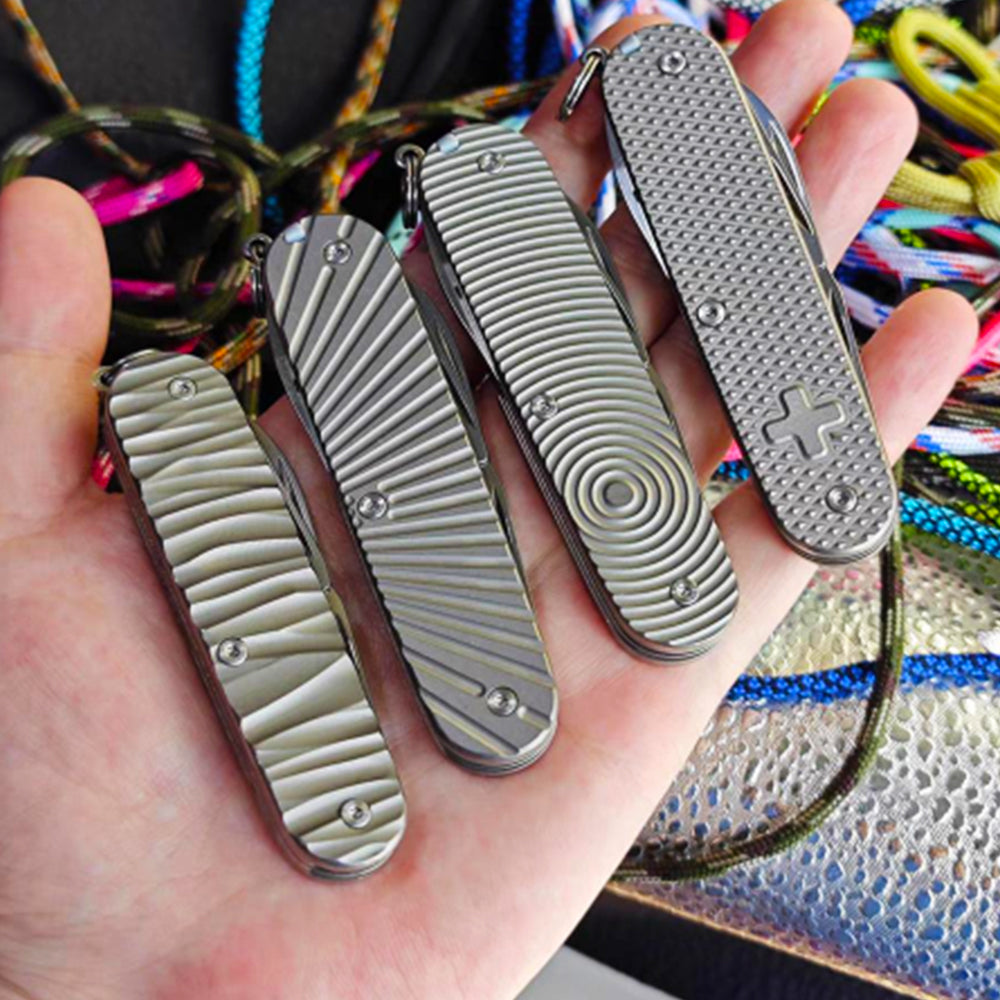El mango de titanio de 91 mm con escala de cuchillo ofrece una mejora premium y ligera para multiherramientas. Diseñado para ofrecer durabilidad y un estilo elegante, incluye revestimientos y tornillos gratuitos para una fácil instalación en estructuras de dos capas, ideal para la personalización posterior.