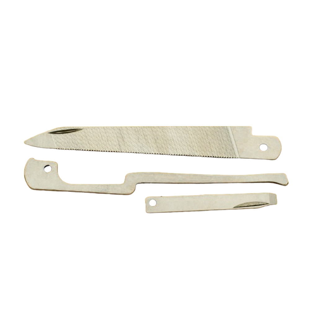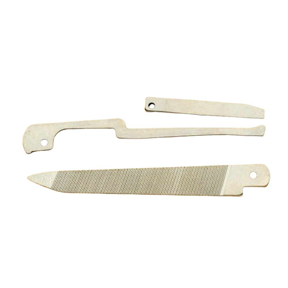 - Parts Included: A combo tool featuring a metal file and saw, a back spring, and a chisel/scraper.